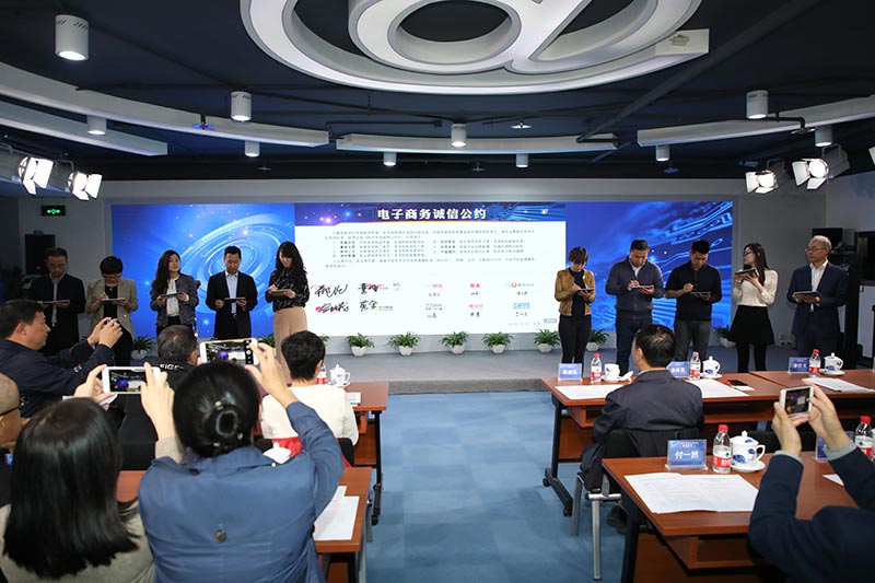 阿里、国美零售、京东、聚美优品、美团、蘑菇街、苏宁易购、网易、唯品会、携程网等十家企业代表共同签署了《电子商务诚信公约》。高海涛 摄